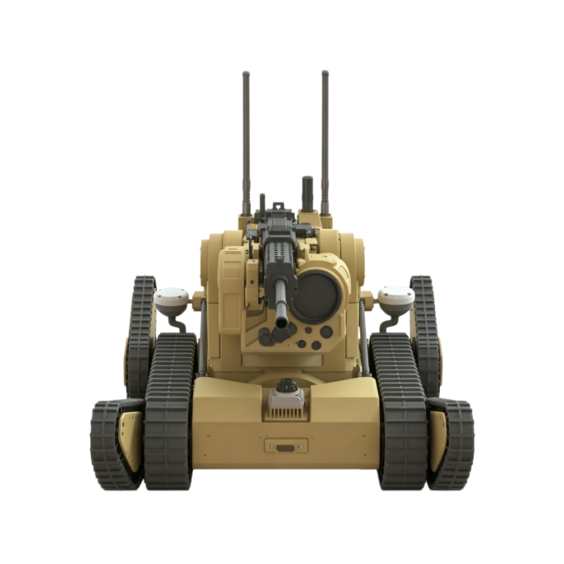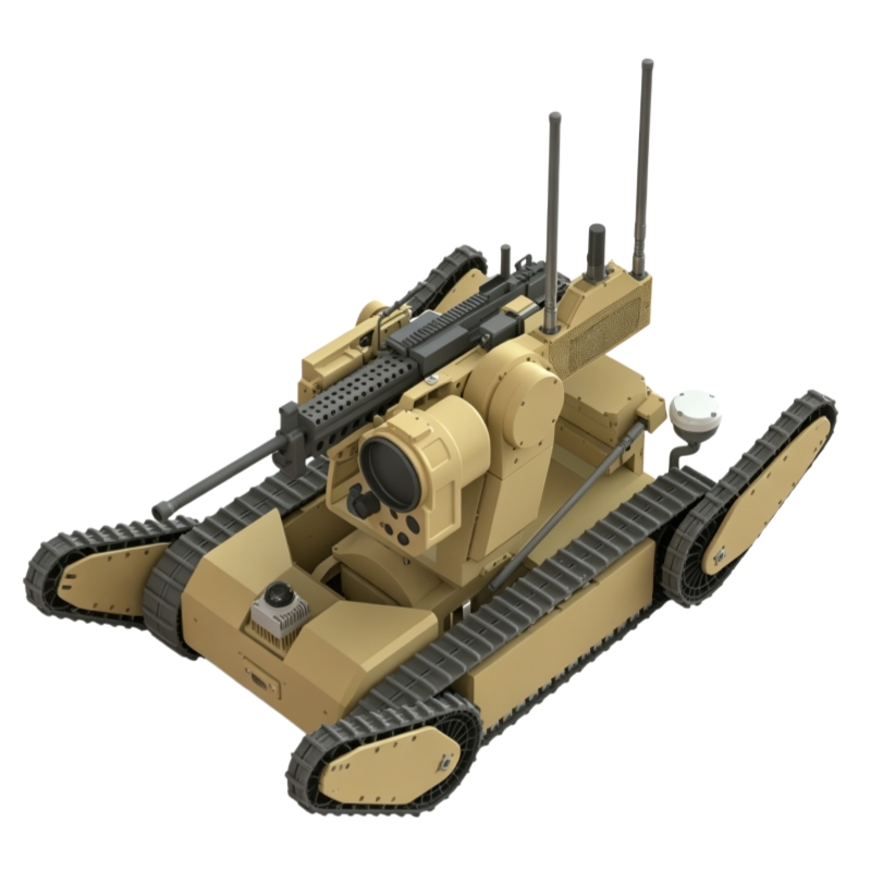 Armed reconnaissance robot equipped with an M249 machine gun (customizable). Weighing only 100kg, it features autonomous target recognition, tracking, and engagement, plus day/night multi‑spectral reconnaissance. Dual‑redundant control and intelligent protection ensure safe operation in urban, ruin, and field combat environments.